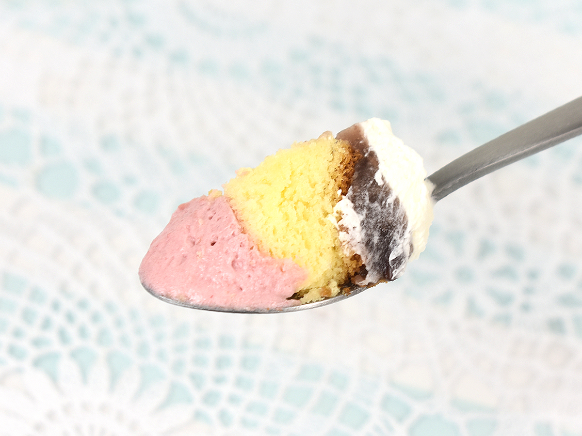 続いてホイップクリームを口にしてみると、いちごの酸味に濃厚なミルク感が混ざり合ってなめらかな口あたりに。ホイップクリームの下からは粒あんが現れ、甘みがさらに強調されていきます。口の中がしっとりしたところで飛びこんでくるスポンジも、空気を含んだフワフワ感がGOOD!