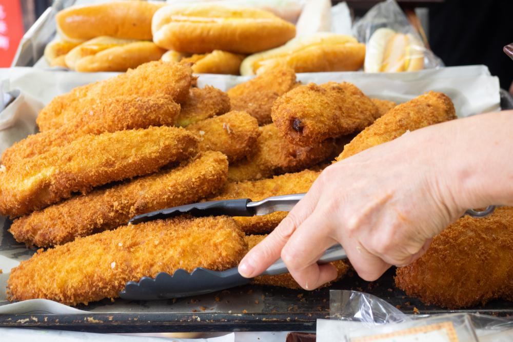 ついついコッペパンサンドに目が行きがちですが、食パンやおやつパン、惣菜パンなどの種類も豊富。なかでも、京都のご当地パンとも言われるニューバード170円は、カレー風味の生地で厚切りハムを挟み、さらに衣をつけて揚げた人気商品です。