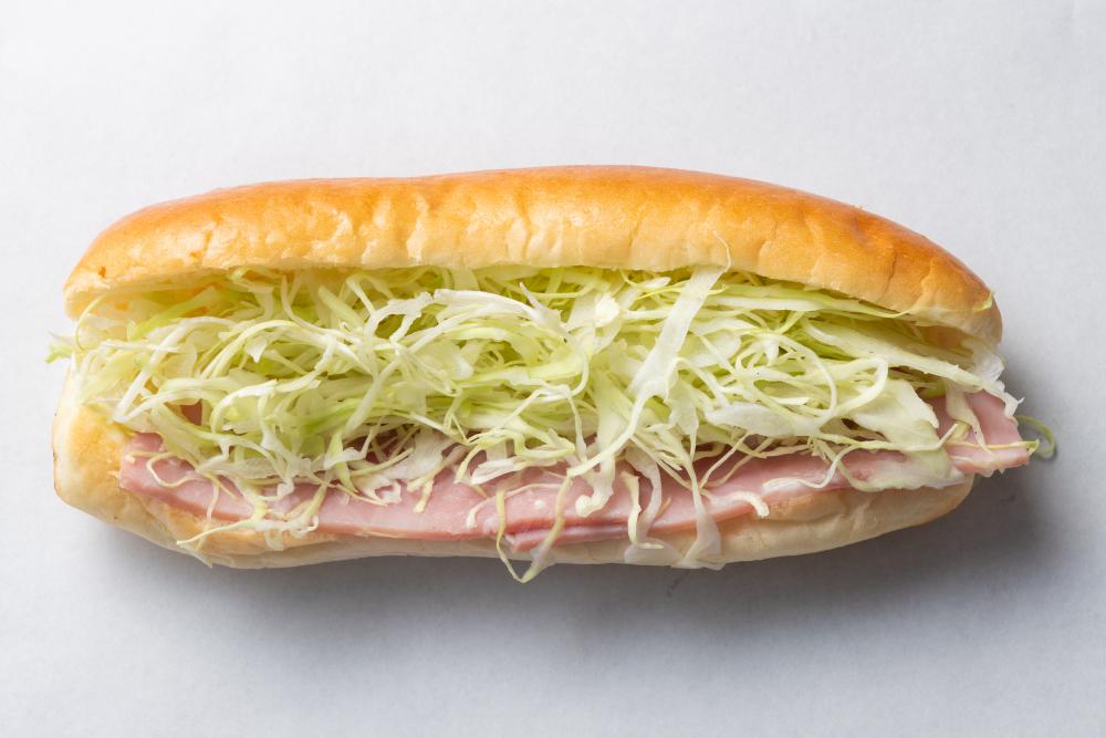 おかず系からスイーツ系まで、14種類前後が揃うコッペパンサンド。一番人気を集めているのがハムとたっぷりのキャベツ、マヨネーズで構成されたハムロール170円です。