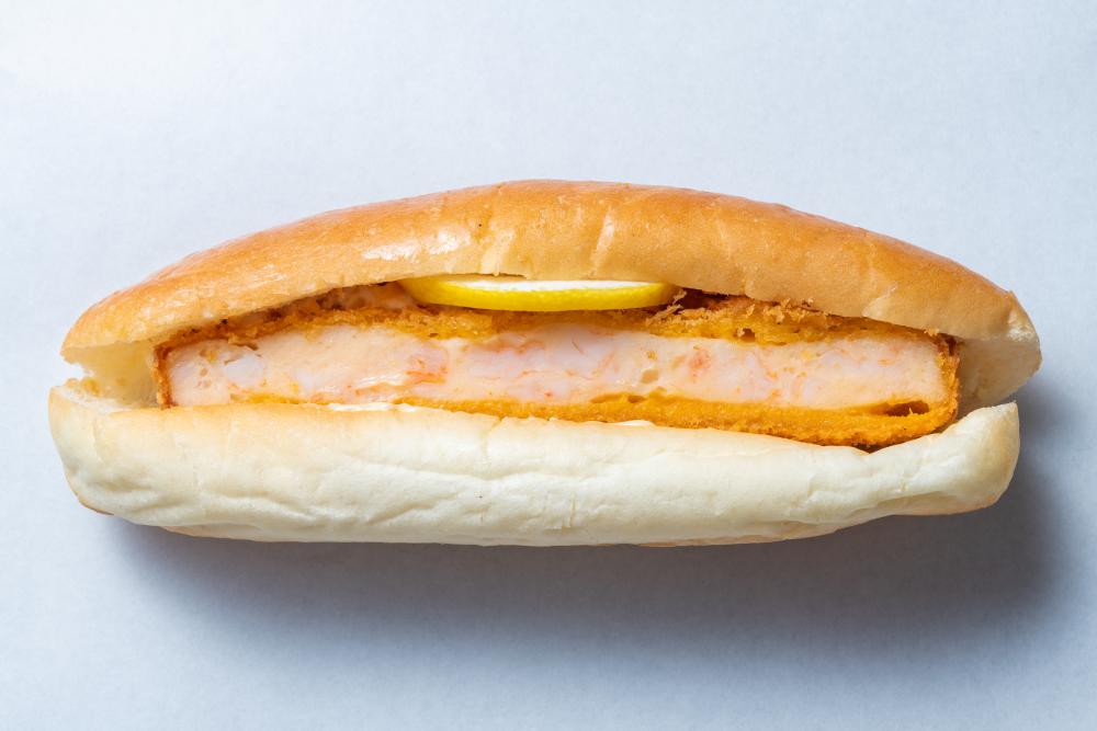 おかず系、なかでも揚げ物をこよなく愛する人におすすめしたいのが、エビプリカツロール260円。その名の通りプリプリ食感のエビカツがドドーンと挟まれた人気商品。相性抜群のタルタルソースにレモンの程良い酸味がアクセントとなった、食べ応え抜群の一品です。