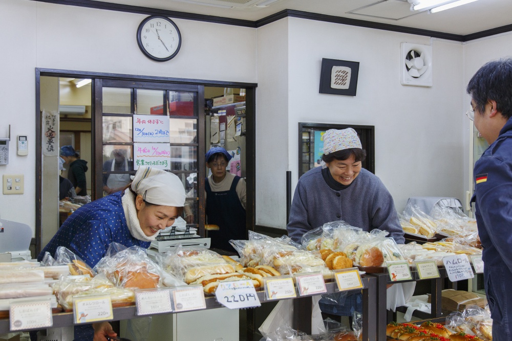 昭和22年(1947)創業の「まるき製パン所」は、昔ながらの対面販売が特徴。笑顔が素敵なスタッフの皆さんが、お客さんの注文に応じてパンを用意してくれます。