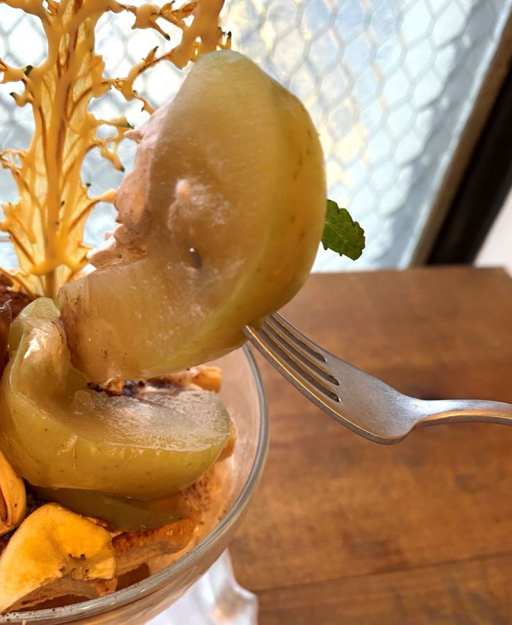 このパフェには名前の通り3種のリンゴが。赤いリンゴは長野産「乙女アルプス」のシナモンリンゴ飴。真っ赤で小ぶりなリンゴは飴をまといつやつやとしています。食べてみるとシナモンが香り、ほどよい酸味と飴の甘さが絶妙にマッチしていました。
