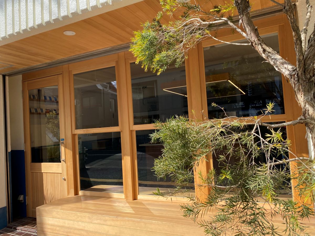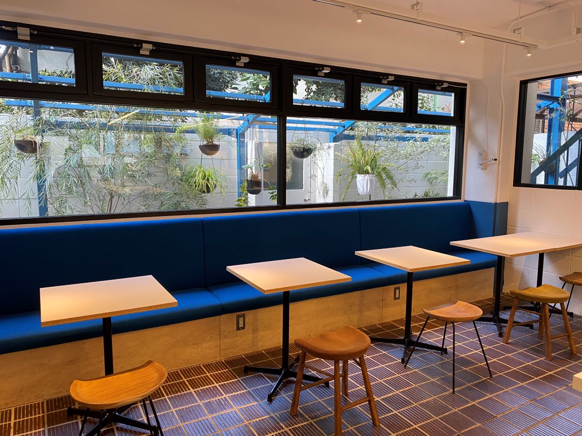 店内も白と青、木目調が基調となっており、北欧テイストのおしゃれな雰囲気。大きな窓の外には植物が植えられており、癒やされます。この日は午前中に伺いましたが、午後になるとこのあたりに西日が当たり、植物がキラキラと輝いて見えるんだそう。