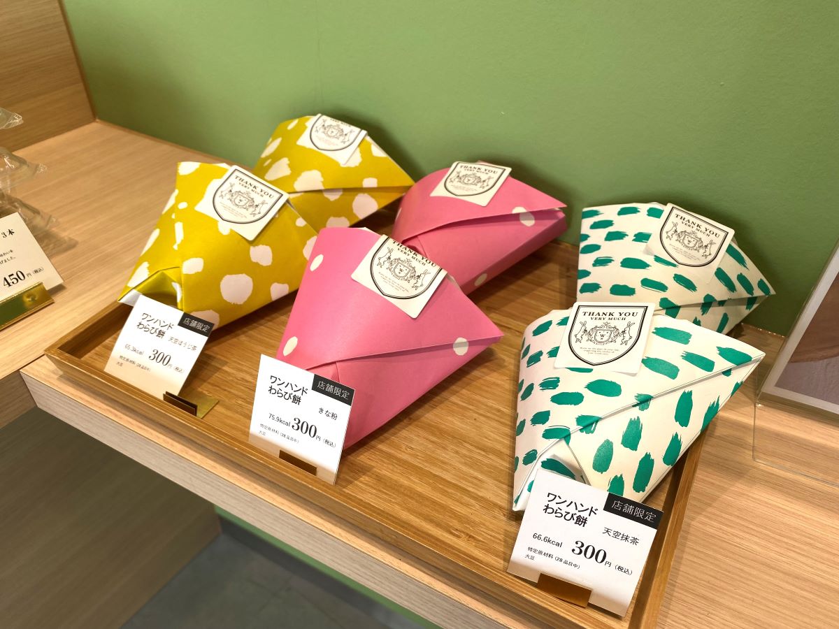 下北沢店限定のメニューのもうひとつが、「ワンハンドわらびもち」各300円。下北沢駅の周辺には、片手で食べられるものが多く、和菓子でも同じように手軽に食べられるものはないかと考案されたそう。