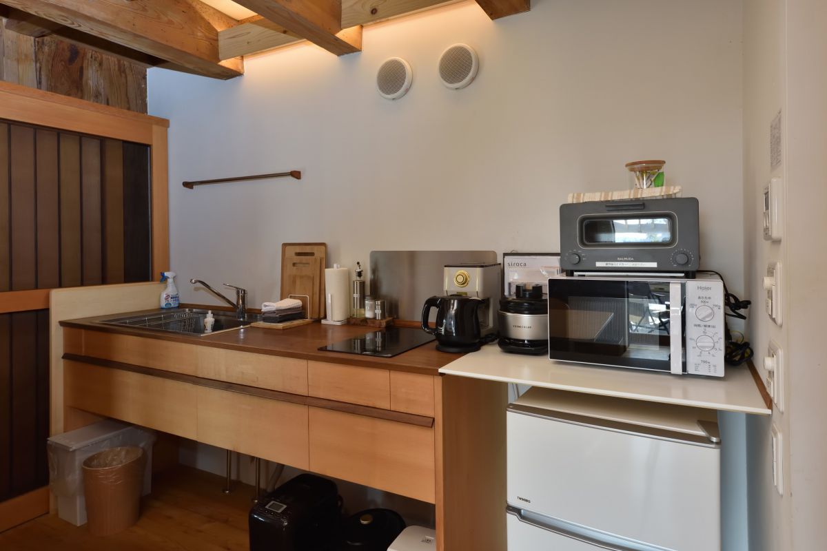 機能的なキッチンと、冷蔵庫、電子レンジ、オーブントースター、炊飯器、ホームベーカリーなど、便利な家電や調味料も揃っています。車で8分ほどの場所にスーパーがあるので、地元食材を仕入れて自炊を楽しむのもいいでしょう!