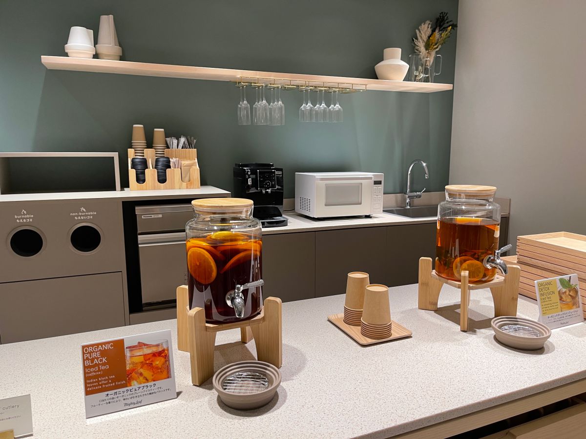 共有ラウンジには、ウエルカムドリンクのオーガニックティーが。4種類のうち2種類を日替わりで味わえるそう。