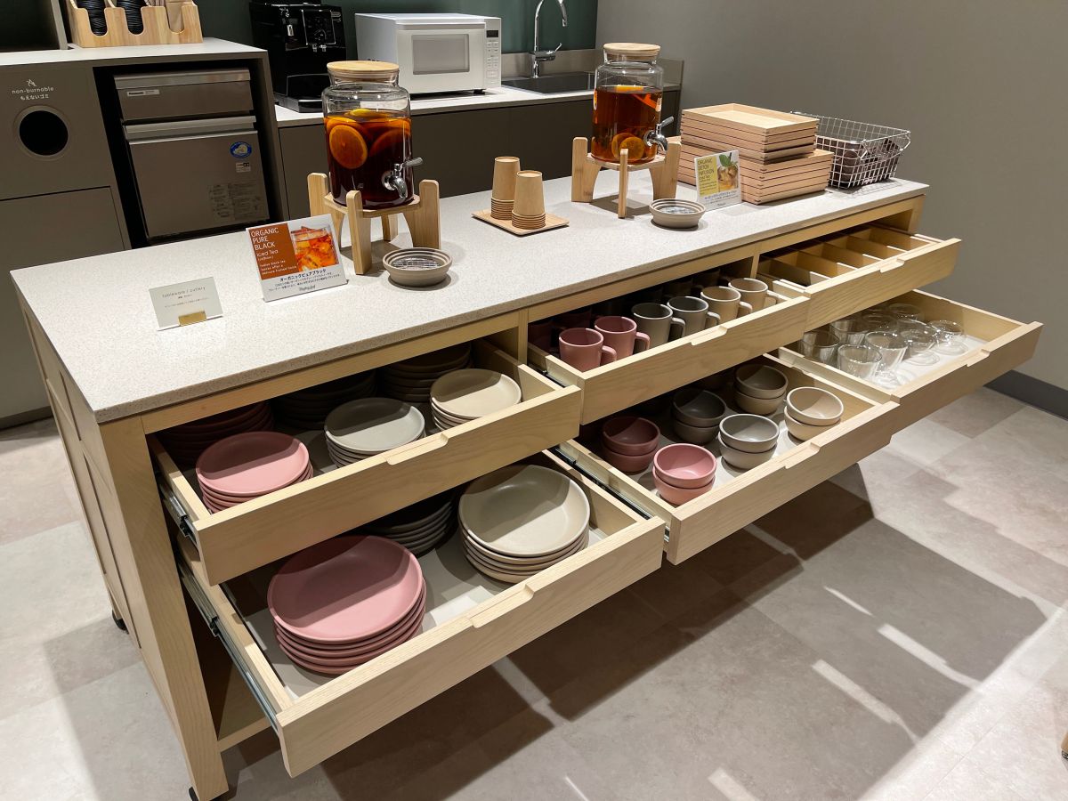 また、宿泊者が自由に利用できる食器・グラス類もずらり。お部屋に持っていくこともできるので、池袋駅近の立地を生かして、テイクアウトしてきたデパ地下デリやスイーツも堪能できちゃいます♪