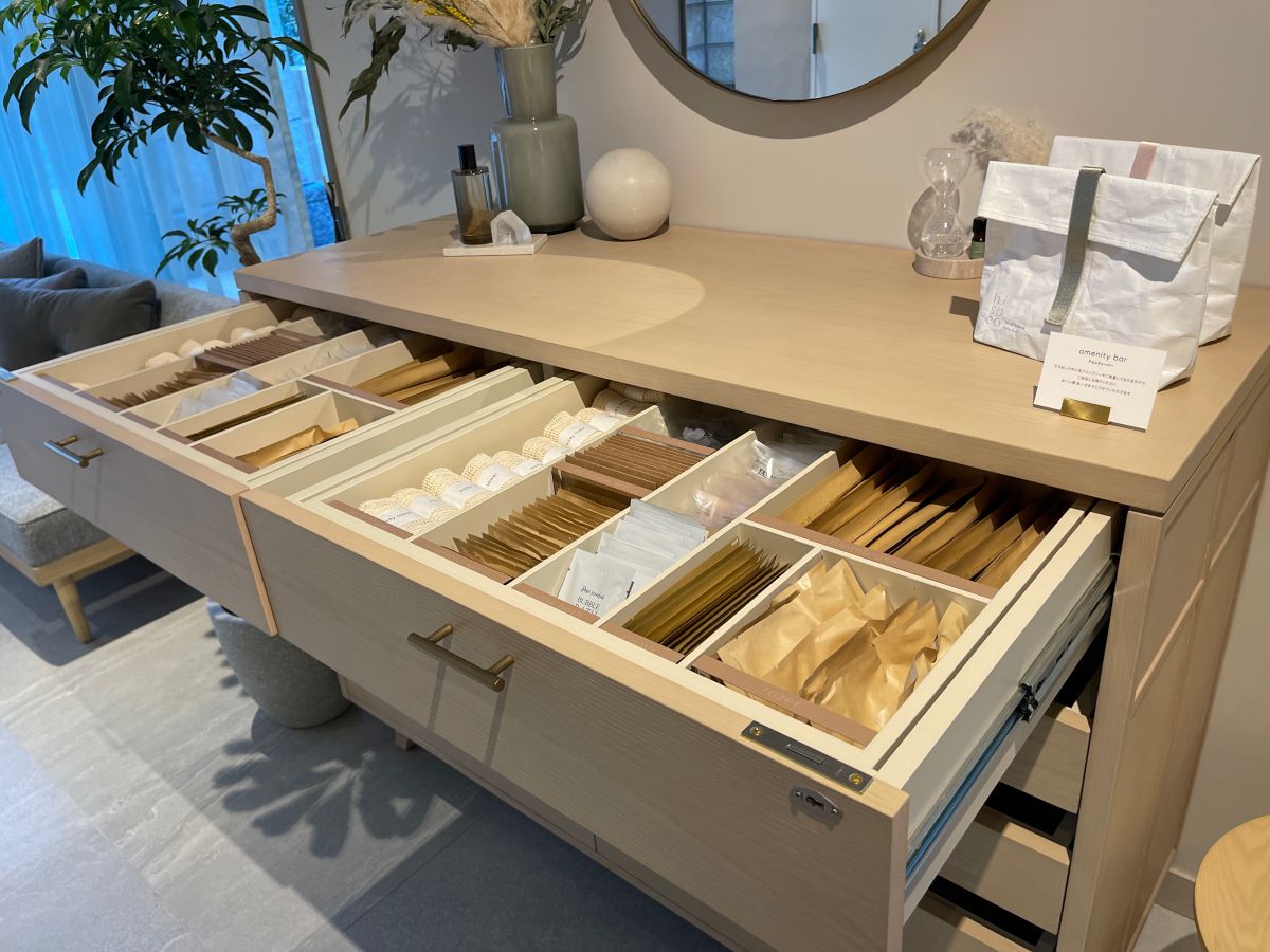 バイキング形式のアメニティーバーがあり、必要なものをチョイスできるのもうれしいポイント。