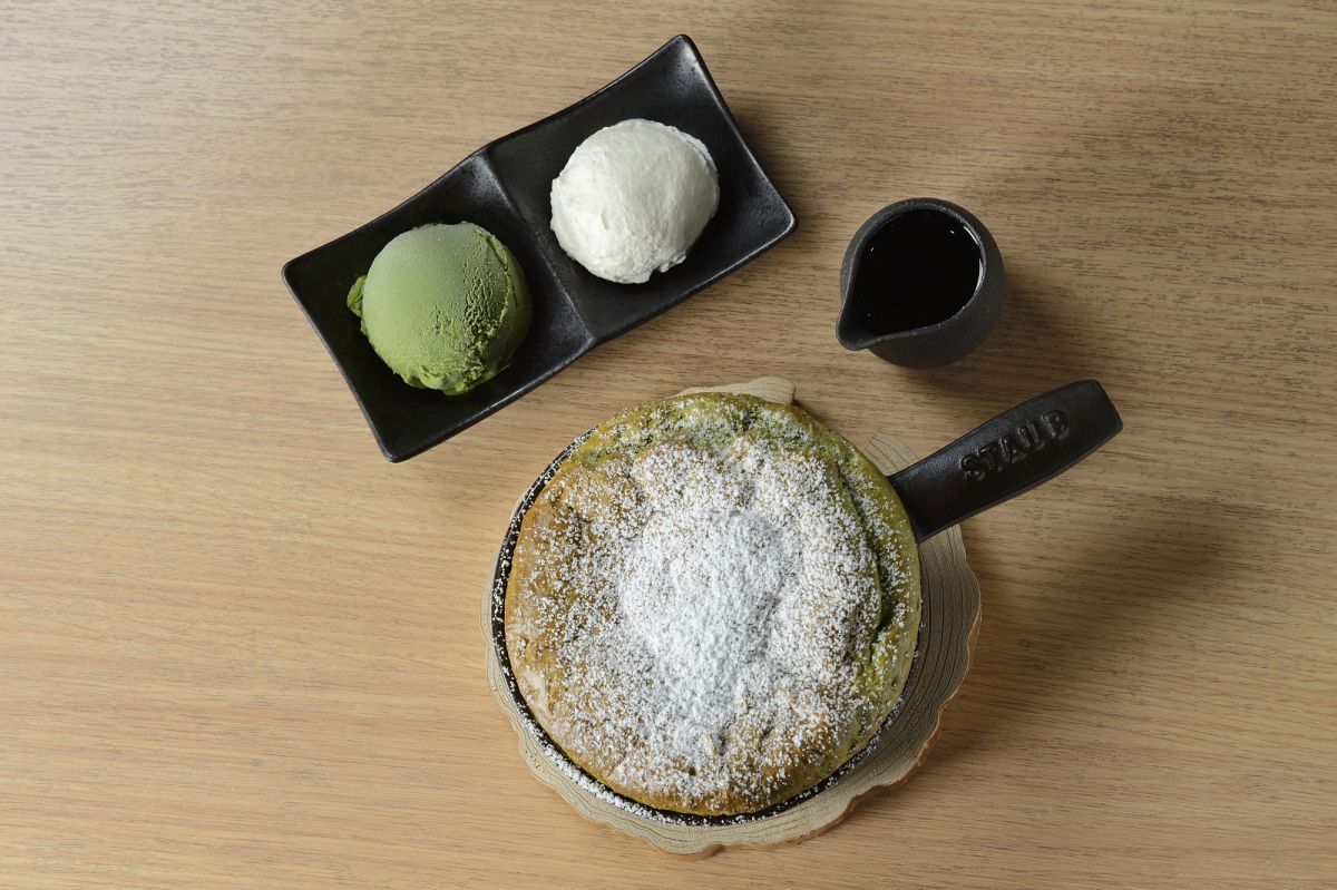 注文を受けてから卵白を泡立てひとつずつ丁寧に手作りする「特製抹茶あずきパンケーキ」1463円。ふわっふわのパンケーキは湯気からもお茶のいい香りが漂い、癒やし効果がありそう。トッピングのクリームと抹茶アイスとの相性も抜群です。