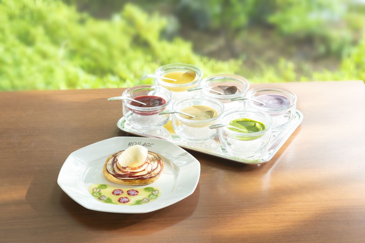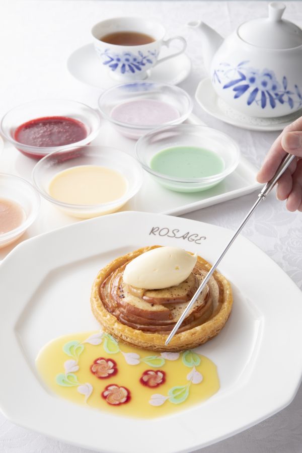 芦ノ湖を見渡すテラス席がある「プレミアムショップ&サロン・ド・テ ロザージュ」の看板スイーツは、「ロザージュ伝統のあつあつりんごパイ~バニラアイス添え~」1800円(ドリンクセット2300円)。目の前でプレートにフルーツソースの花びらなどを描いてくれるサービスが素敵なんです。芦ノ湖畔に浮かんでいるみたいなロケーションもGOOD。