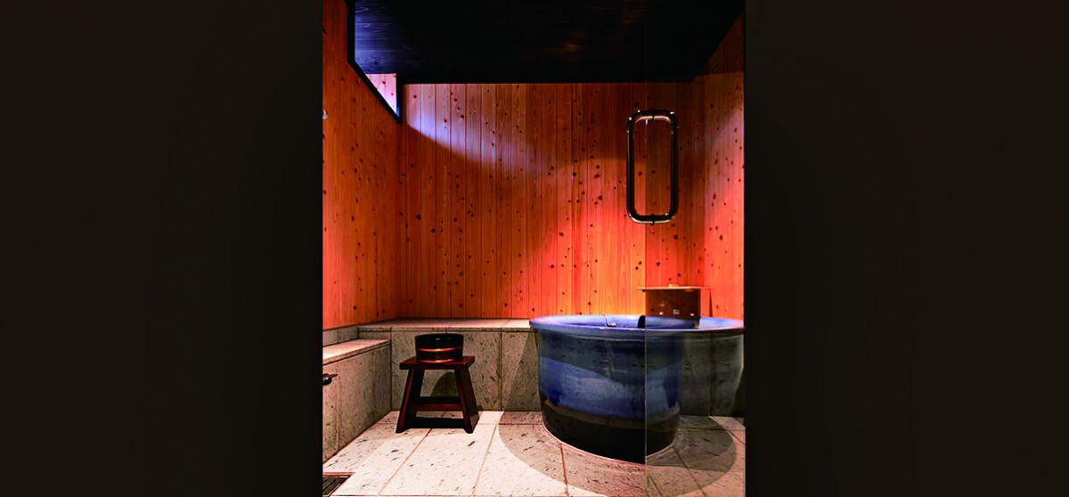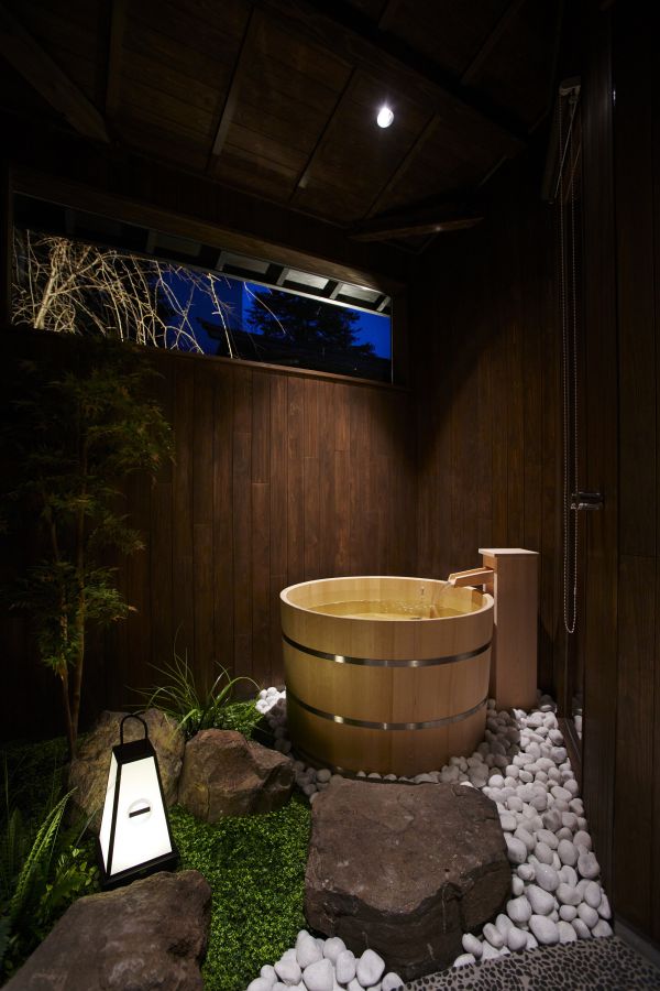 バスルームには信楽焼で造られた浴槽を備え、信楽焼特有の色合いと風合いに温もりが感じられ、保湿効果もあります。洗面台のボウルも信楽焼を使用。随所にモダンなデザインと日本の伝統美のコラボが楽しめる女性におすすめの1棟で、こちらは1泊朝食付(2名利用時)1名1万7000円~。