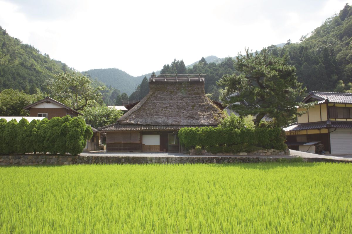 周囲の自然に溶け込んだ高台に立つ、美しくカットされた茅葺き屋根の古民家「美十八(みとや)」。ここでは囲炉裏を囲んで鍋料理や、山々を望む縁側で里山時間を満喫するのがおすすめ。