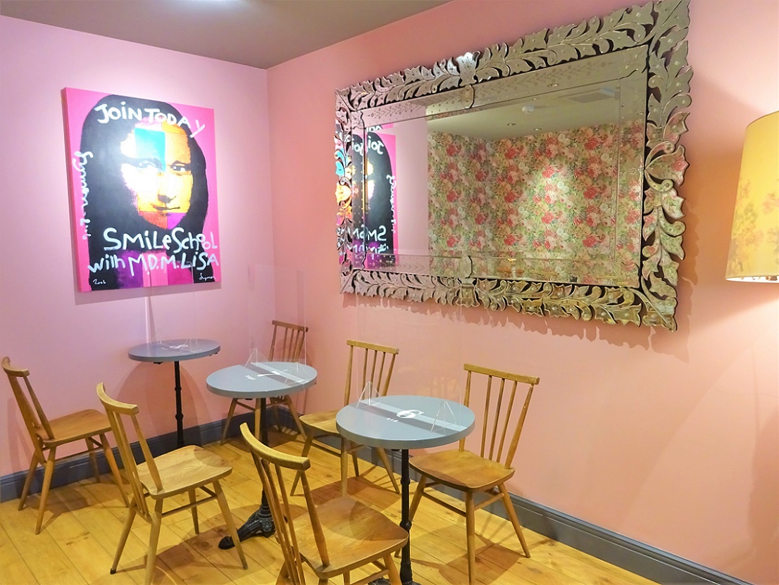 もう一方の壁紙はピンク一色で、大きな鏡やアート作品も飾られておしゃれな雰囲気。鏡の中に、向かい側の花柄の壁紙が映り込むのもユニークな演出です。