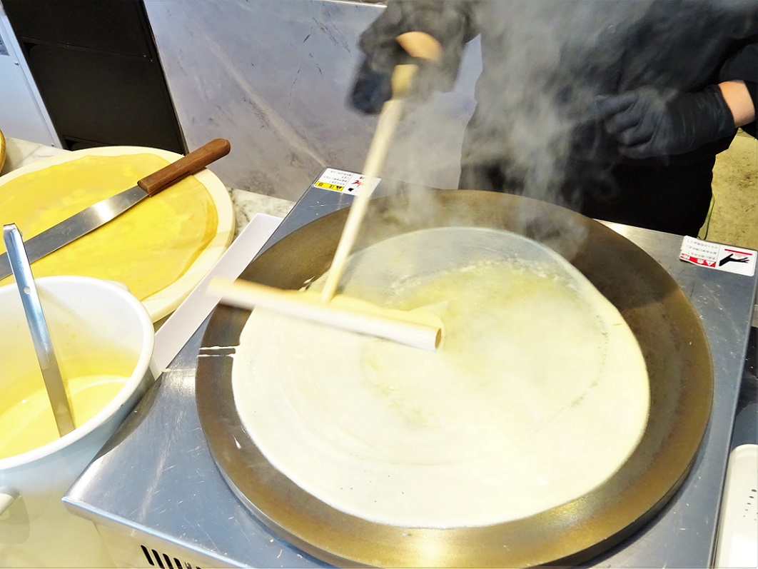 クレープはオーダーが入ってから一つずつ手作り。専用のホットプレートに生地を流し込み、コテを使ってムラができないようにうす~く伸ばすことがポイント。約170℃の熱で焦げないように気を付けながら、スピーディーに焼き上げます。
