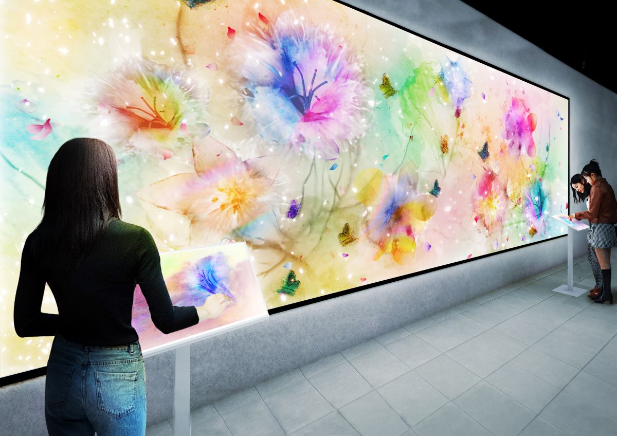 「COLORS(カラーズ)」は壁に触れると、水彩絵具のように、植物、光、水などの自然界の要素が現れ、景色が変わっていくインタラクティブアート。グリーンで描かれた植物にイエローの光を与えると成長するなど、自然の生態系が生み出されていくのが特徴です。
