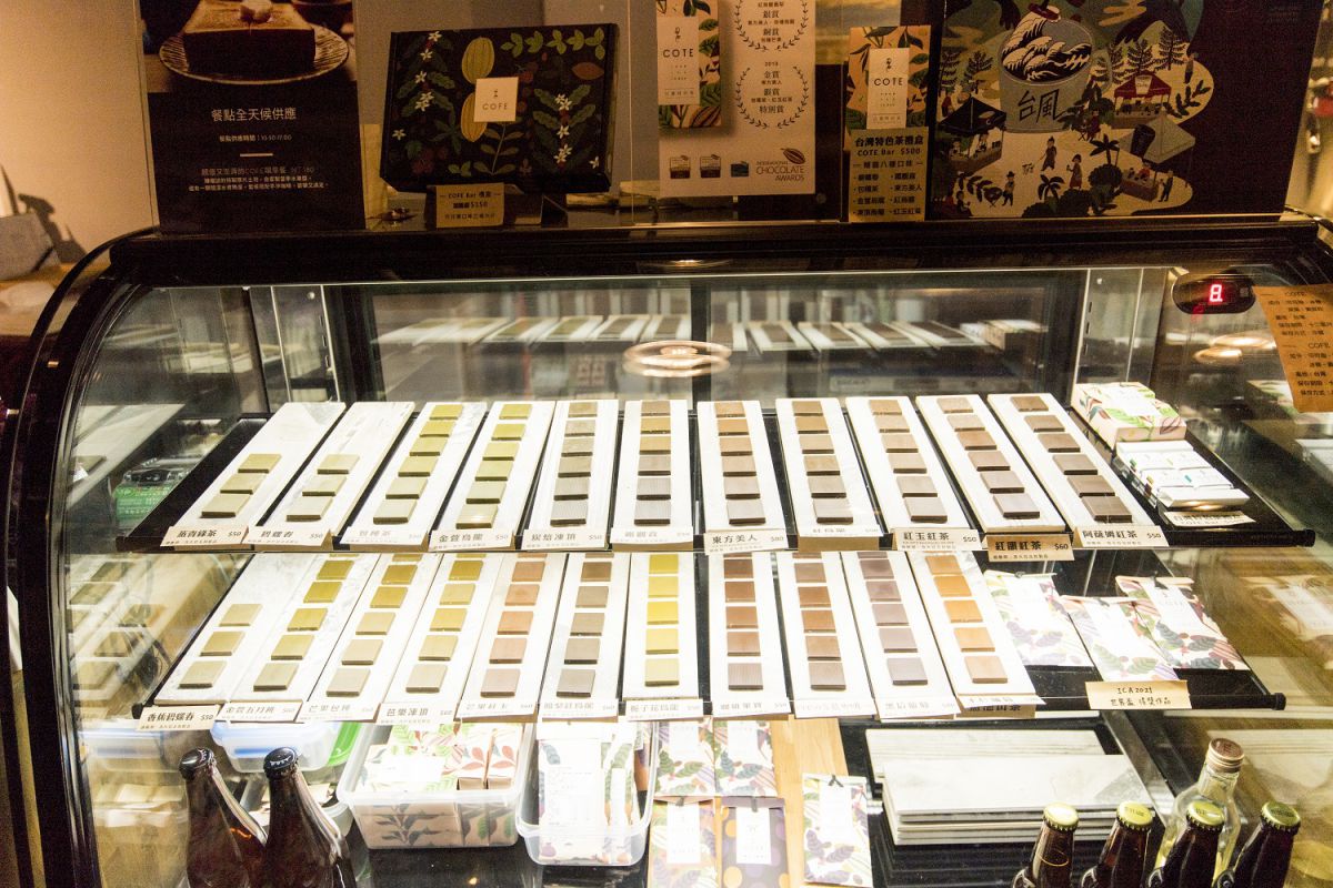 こちらでまずいただきたいのは、台湾茶やコーヒー、ワインなどを使った特製チョコレート「COTE」各NT$50~。ショーケースにずらりと並んでいるので、実物を見ながら選ぶことができます。初めてなら、鐵觀音や東方美人など8種類の台湾茶チョコ食べ比べができるセット「台灣特色茶禮盒」NT$500がおすすめです。