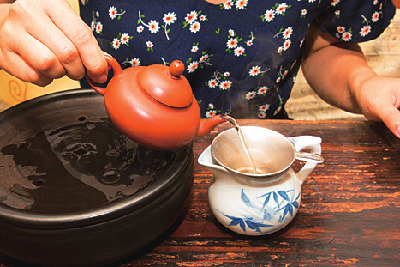 再び茶壷にお湯を入れて蒸らします。蒸らし時間は30秒~1分(茶葉により異なる)。時間が経ったら、茶壷から茶海にお茶を注ぎます。