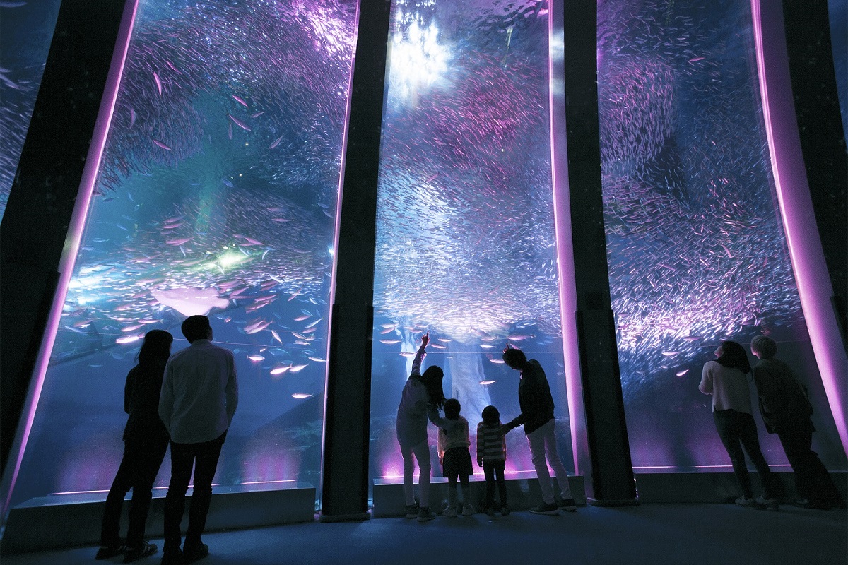 水族館「アクアミュージアム」にある高さ8m、水量1500tの大水槽では、国内最多飼育数となる5万尾のイワシが、音楽や照明に合わせ乱舞する「スーパーイワシイリュージョン」を毎日開催しています。4月22日(金)までの期間限定で、春を代表する楽曲に合わせて、水槽をピンク色にライトアップする「スーパーイワシイリュージョン ~桜花乱舞~」を開催。
