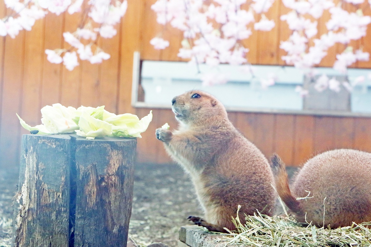 水辺と森に暮らす生きものを展示するエリア「フォレストリウム」内の「プレーリーガーデン」では、桜の装飾や木のテーブルを設置。プレーリードッグの大好物・キャベツやニンジンも置いて、桜の下でもぐもぐタイムが見られるという、お楽しみが!