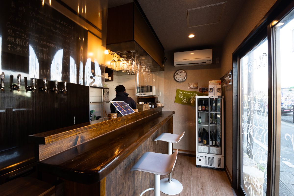 3坪の店内には、店主の稲村さんが設計したという奥行き40cmの木製のカウンターが設置されています。「ビールを楽しむためのグラスやお皿などが置ける、ギリギリの距離感にしました」という席に座ってみると、ビアタップとの近さに驚きます。