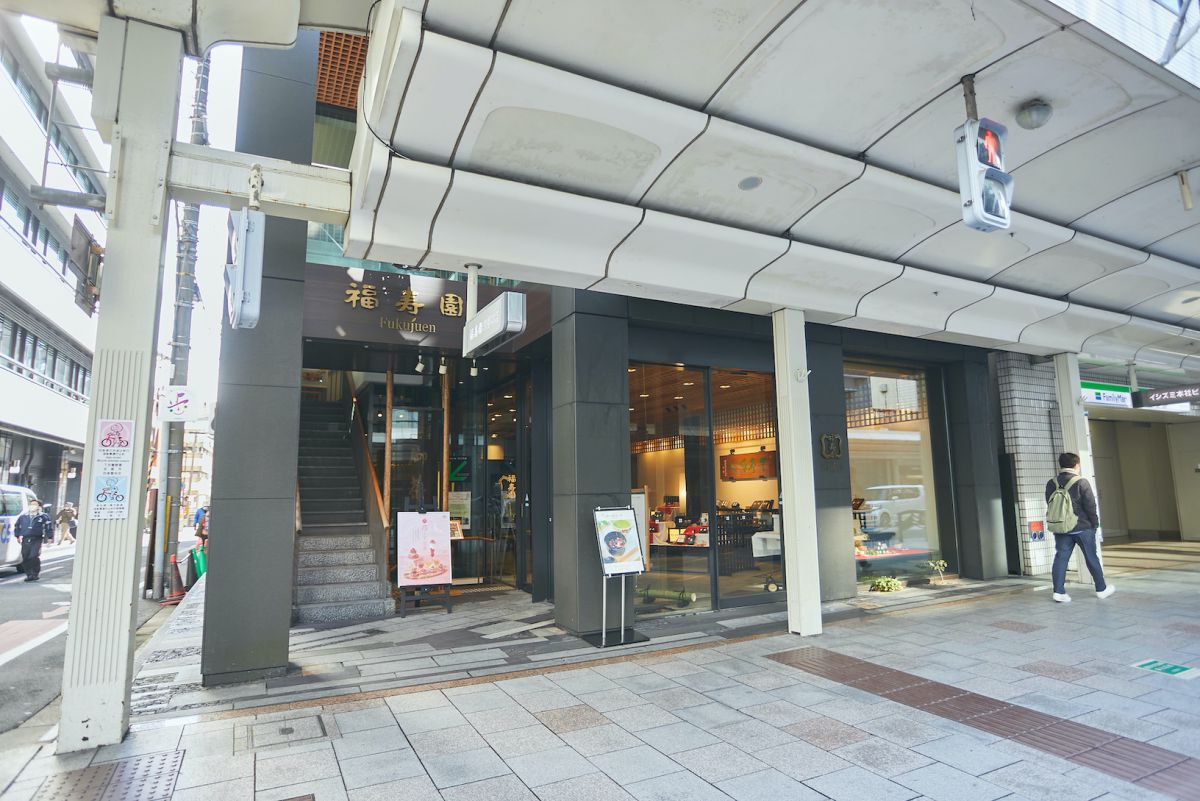 ビル全体が福寿園の建物で、地下1階から地上9階まで福寿園の運営する茶販売店、フレンチレストランや茶室、事務所などが入っています。「茶寮 FUKUCHA 四条店」は2階。店内エレベーターのほか、1階の外階段からも上がれます。