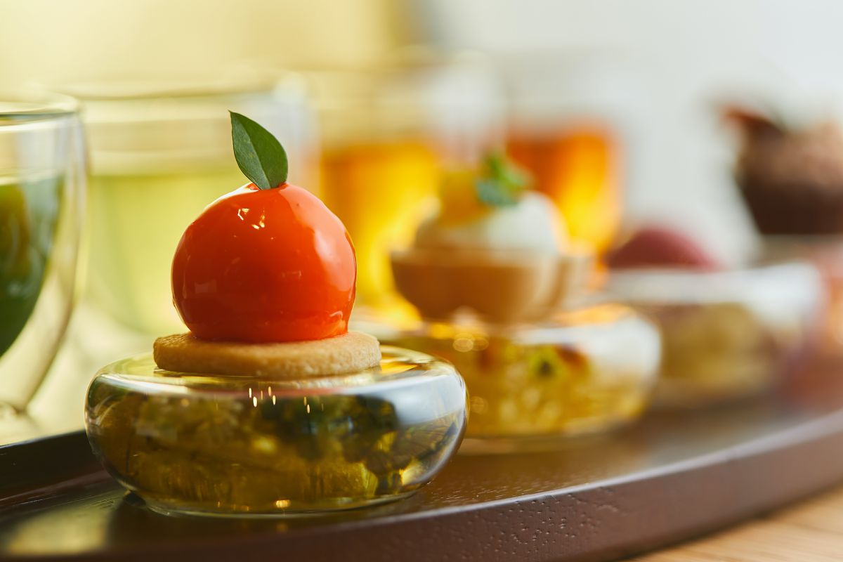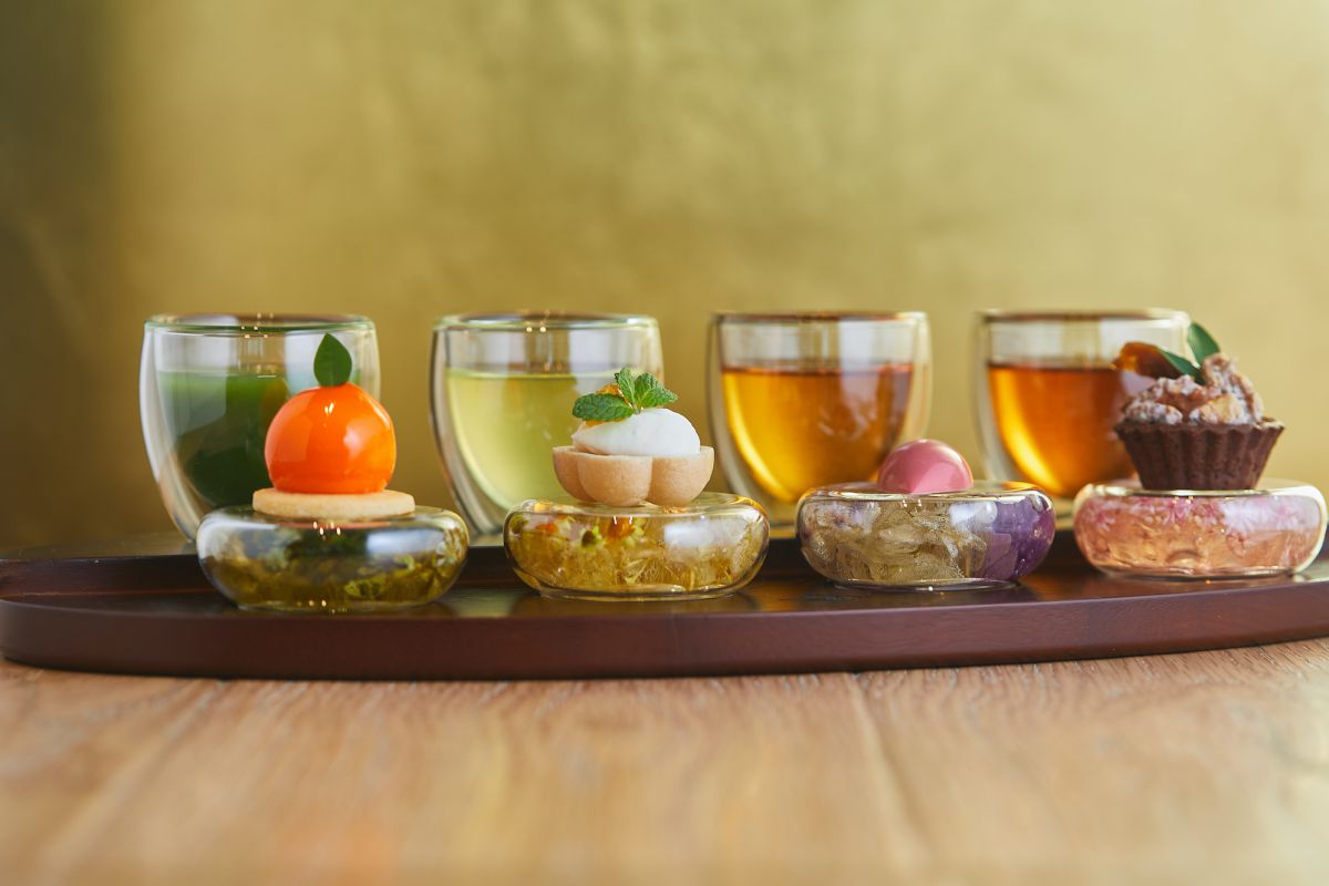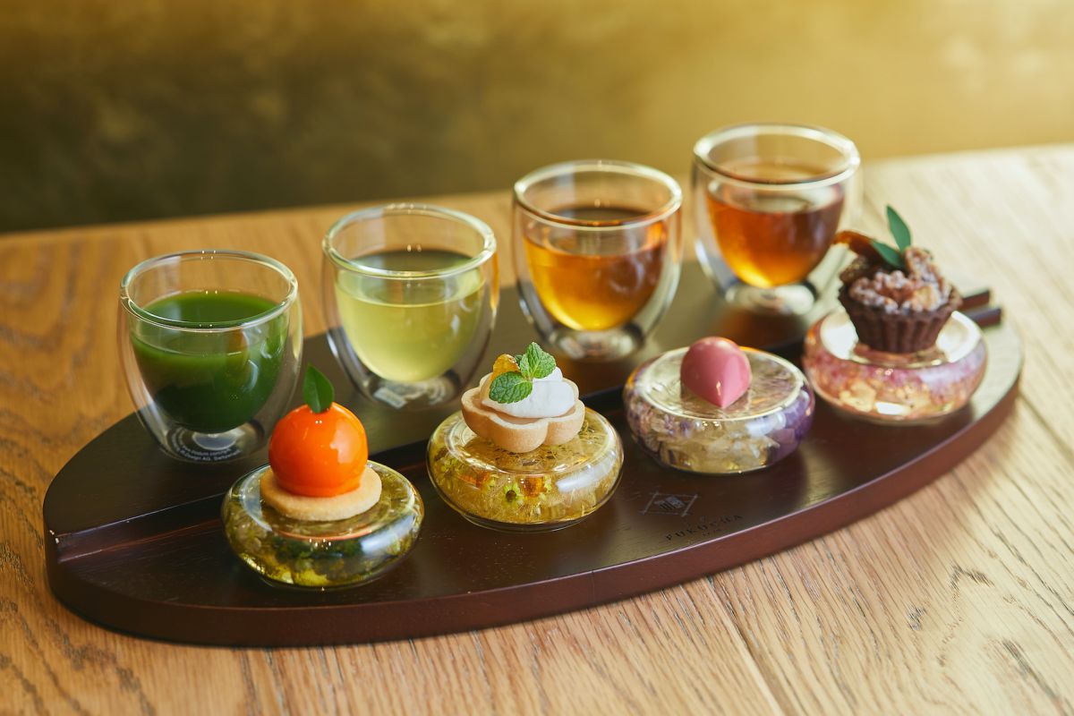 左から順に「宇治抹茶×ショコラオランジュ」「煎茶×柚子クリーム最中」「和紅茶×ミルティーユショコラ」「ほうじ茶×クルミとイチジクのタルト」。お茶と合わせたひと口サイズのお菓子は、ホテルなどで研鑽を積んだパティシエが自分の世界観をぎゅっと詰め込んで自由に表現したもの。