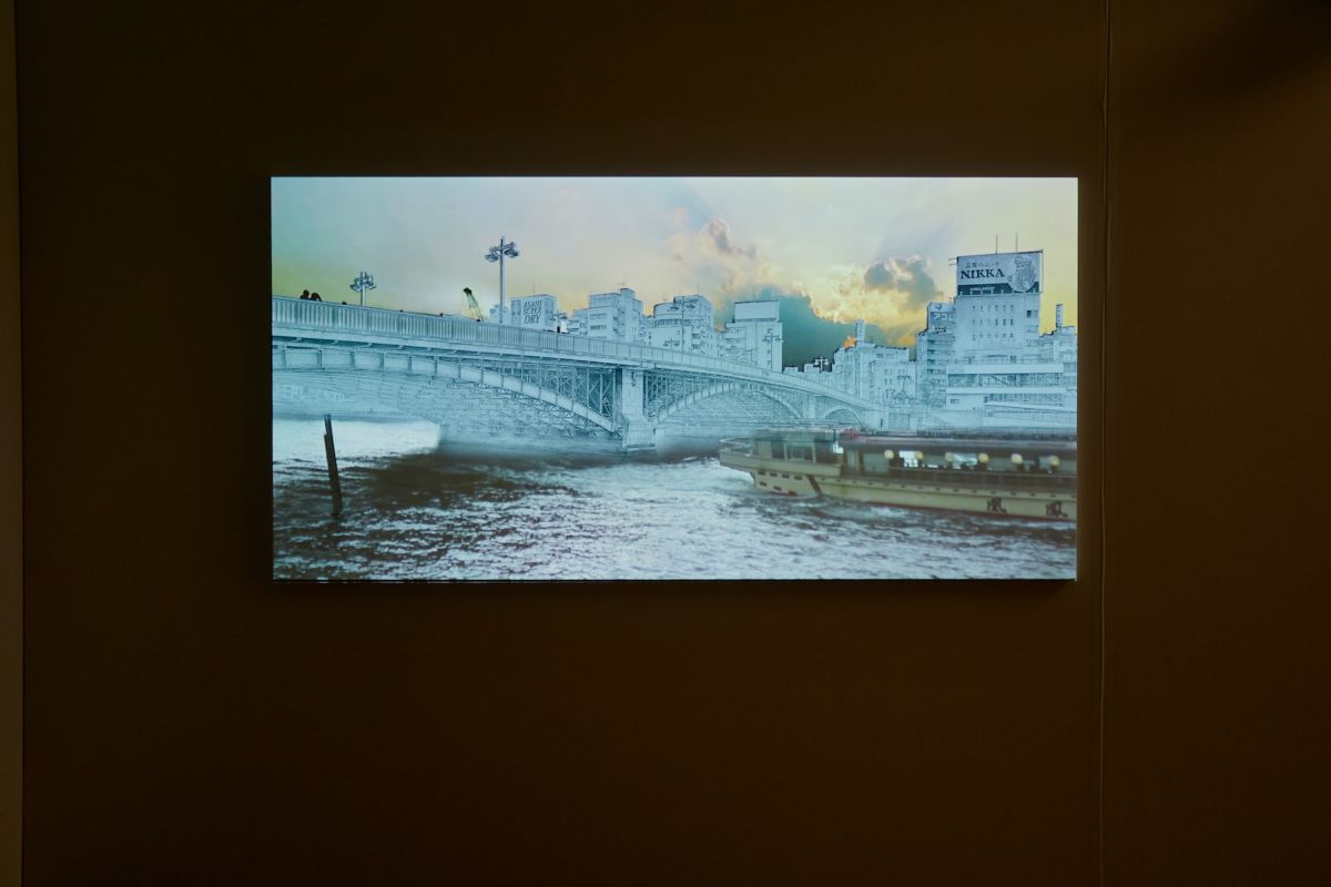 もうひとつの展示は、京都精華大学美術学部卒業の作家・ヤマガミユキヒロ氏の作品。都市や自然の風景を、鉛筆で緻密に描き、同じ視点から撮影した映像をプロジェクターで投影する「キャンバス・プロジェクション」という手法の作品が展示されています。
