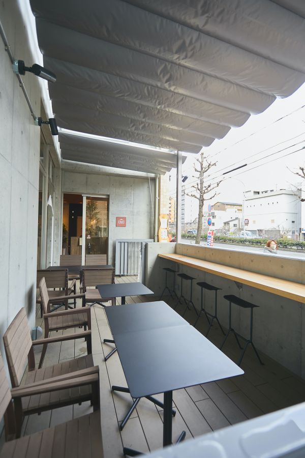 気候がよければ、テラス席も。屋根付きなので、雨降る景色を眺めつつ、読書するのもいいですね。