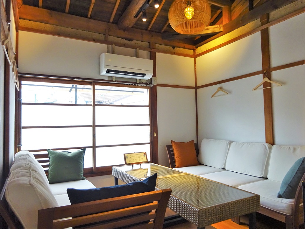 写真の4人前後で使える大きめの席のほか、2名掛けのテーブル席もスタンバイ。2グループ限定の小ぢんまりとしたフロアですが、梁がむき出しになった高い天井のおかげで広々とした印象に。ソファに座ってゆったりとくつろげる空間です。