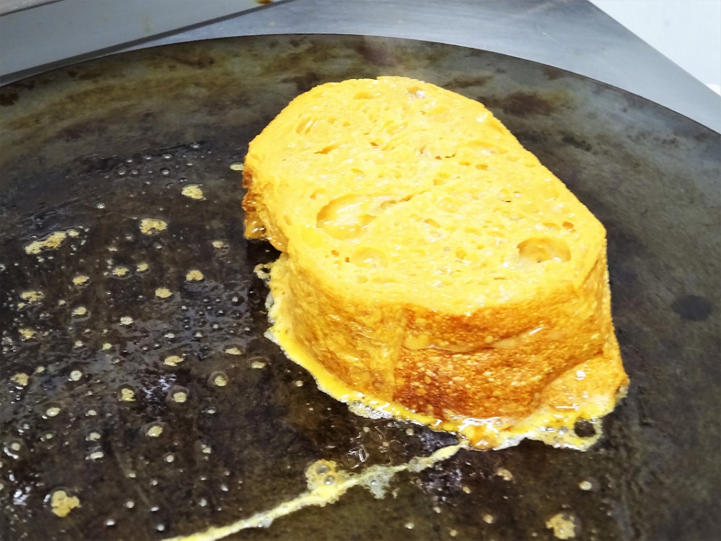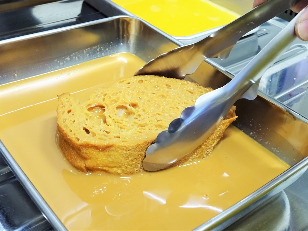 フレンチトーストには、フランスパンを使用。厚切りにしたパンに、自家製の塩キャラメルソースと溶き卵を染み込ませます。
