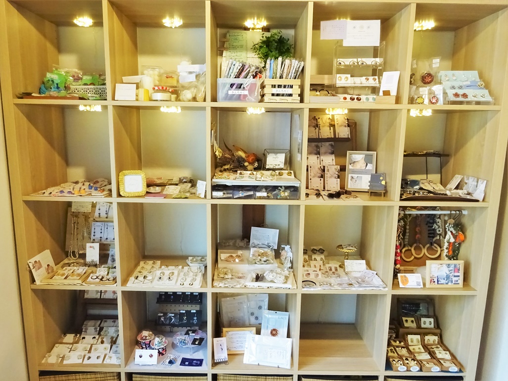 1階ギャラリーではハンドメイド雑貨の販売も。全国から集めている作家さんの小物が棚ごとに展示されていて、眺めるだけでも楽しめます。1カ月を目安にラインナップが替わっていくそうなので、訪問するたびに要チェックのコーナーです。