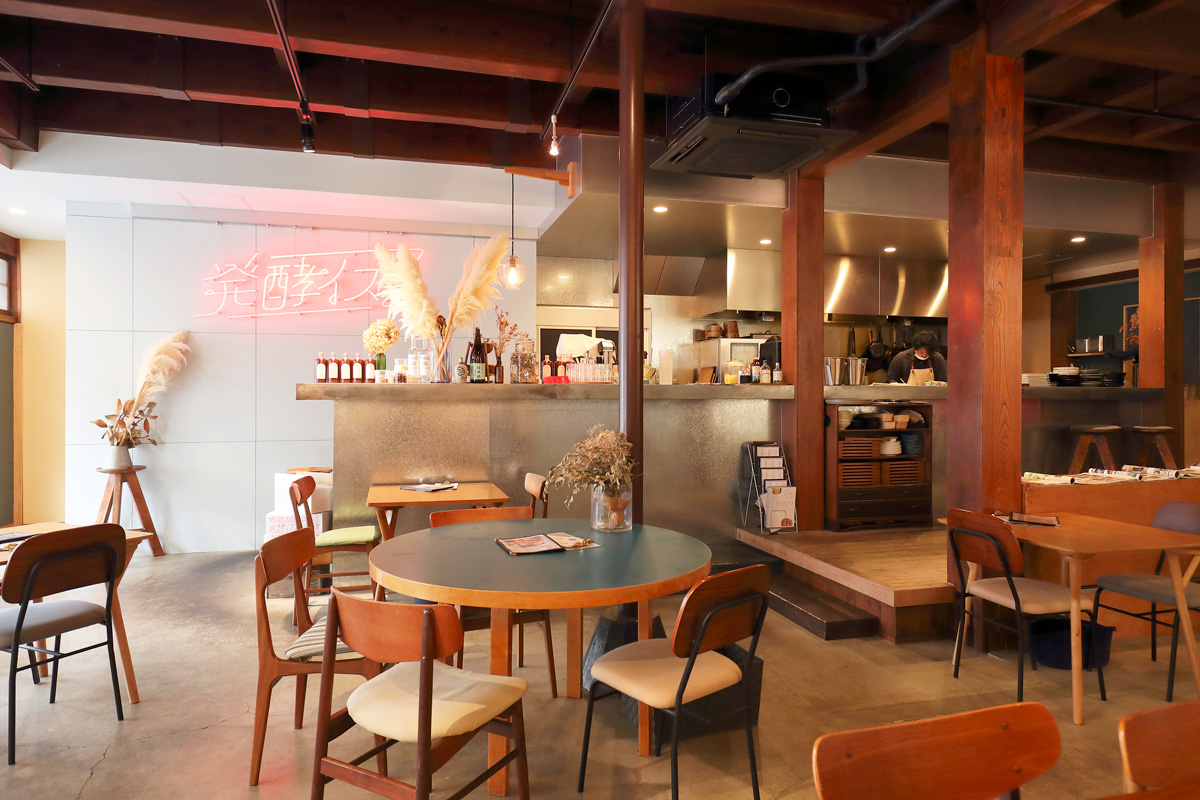 ランチにやってきたのは、仲見世通りの入口・仁王門から善光寺表参道を歩いて5分の場所にある「HAKKO MONZEN(ハッコウ モンゼン)」。大正時代に建てられた商家をリノベーションしたお店で、信州で親しまれてきた発酵食品を使った創作料理が味わえます。外観は古き良き町屋そのものですが、店内は北欧テイストの家具や「発酵イズム」というネオンがおしゃれで、新旧が不思議とマッチしています。