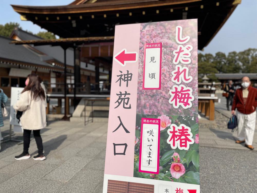 社殿西側に広がる神苑内の「春の山」には、約150本ものしだれ梅が植えられています。薄紅色のものや白いものなど、同じ梅でも色はさまざま。そのグラデーションも見事です。