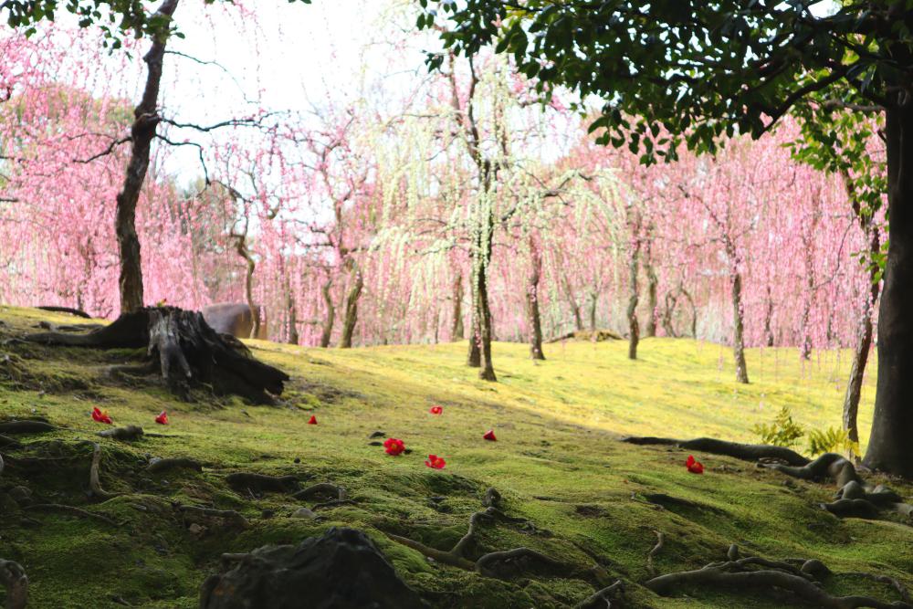 薄紅色の梅に、真紅の椿、さらに苔の緑のコントラストが美しく、ほかではなかなか見ることができない光景です。