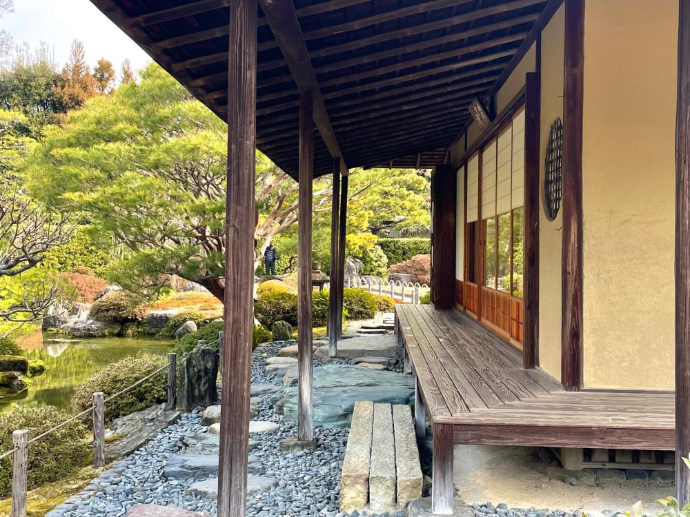 桃山の庭と室町の庭の間には、お茶席「楽水軒」があります。「しだれ梅と椿まつり」の期間中、こちらでは、庭園を眺めながら和菓子とお抹茶(拝観料とは別に300円の志納)をいただくことができます。(2022年の「しだれ梅と椿まつり」では閉じています)