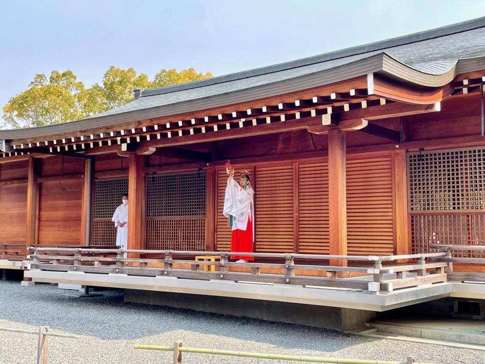 しだれ梅と椿まつりの期間には、神楽殿の表舞台で「梅が枝神楽」が行われます。梅が枝神楽とは、梅の花を冠に挿した巫女さんが、梅の枝を持って舞う神楽のことです。また、梅の花守り(初穂料1体1000円)の特別授与も行われており、お守りを受けられる方には、巫女さんが神楽鈴でお祓いしてくれます。