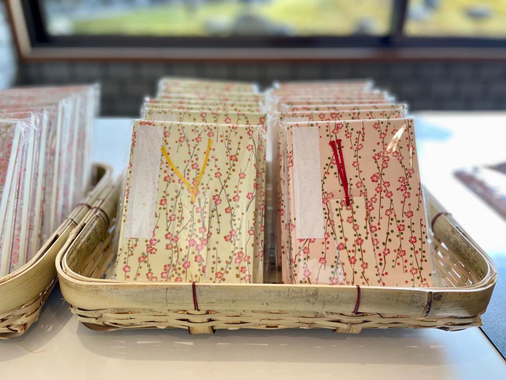 御朱印帳も、しだれ梅をあしらったものが登場。装丁に友禅和紙が使われた、上品な雰囲気の一冊です。城南宮の御朱印帳は、季節によって絵柄が変わります。例年、12月1日から翌年分のしだれ梅の御朱印帳の取り扱いが始まるそう。写真は令和4年分の御朱印帳で、同じ友禅和紙を使用したしおりがセットになって1500円です。