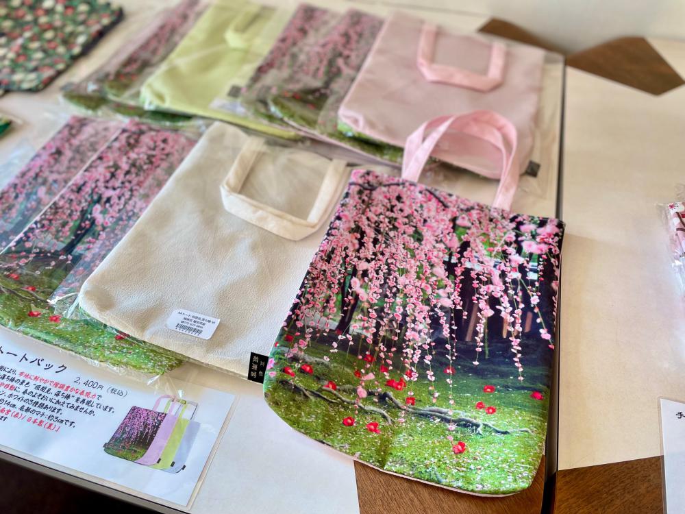 なんと、しだれ梅をプリントしたA4サイズのトートバッグ2400円も!最新の転写技術でプリントされているそうで、色鮮やかにしだれ梅と椿が表現されています。