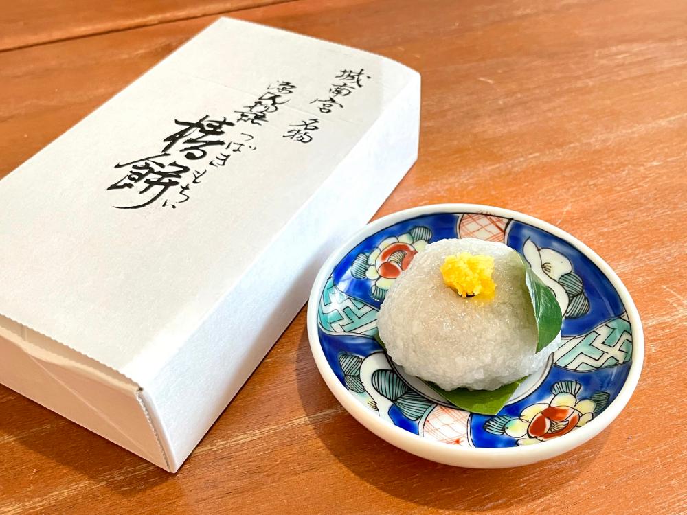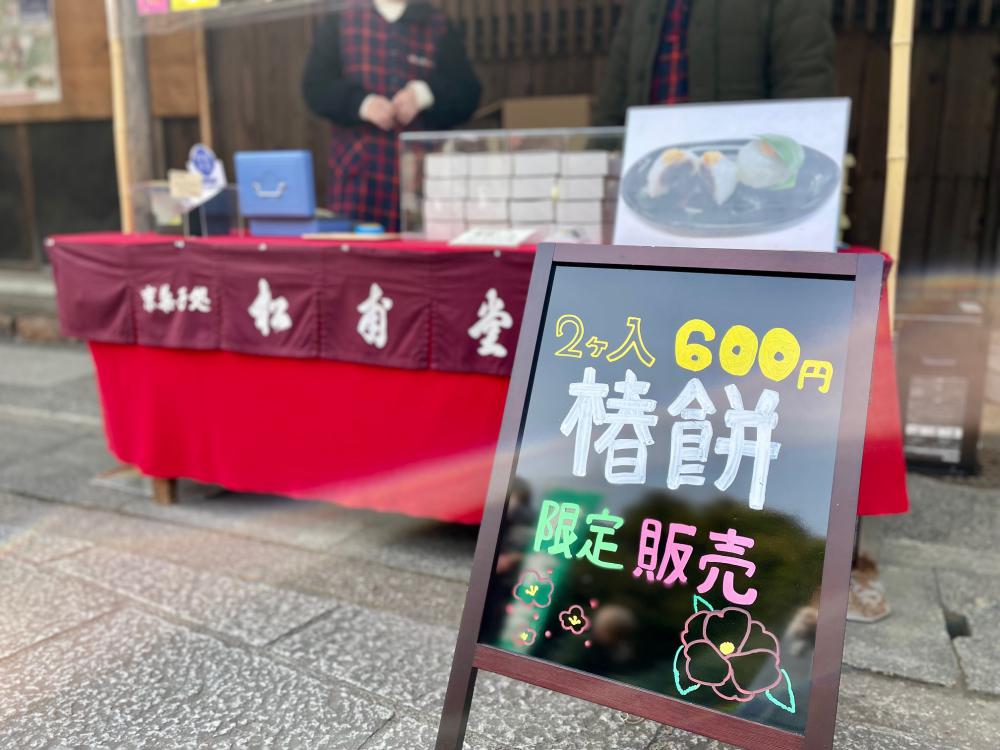 この期間、楽しみにしている方も多いのが、名物の「椿餅」。和菓子店「松甫堂(しょうふうどう)」が出店し、椿の葉で挟んだ椿餅をこの時期に城南宮の参道でのみ、限定販売されています。