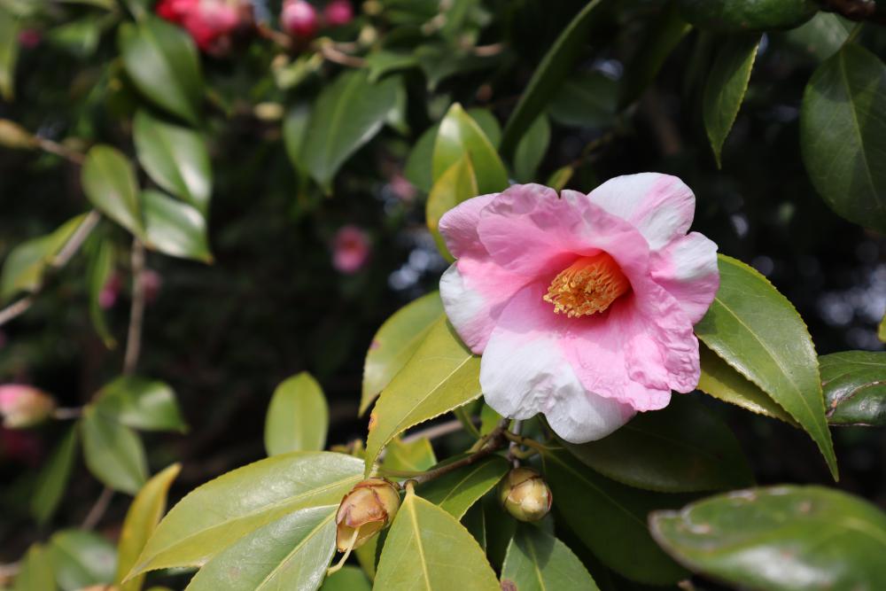 神苑には、梅のほか、約120品種・約400本もの椿も植えられています。品種によって花が咲く時期は異なりますが、2月には真紅の「城南椿」が花を咲かせます。タイミングが良ければ、満開のしだれ梅と落ち椿の共演を楽しむことができ、しだれ梅と落ち椿をひとつのフレームに入れる、すてきな景色も楽しめます。