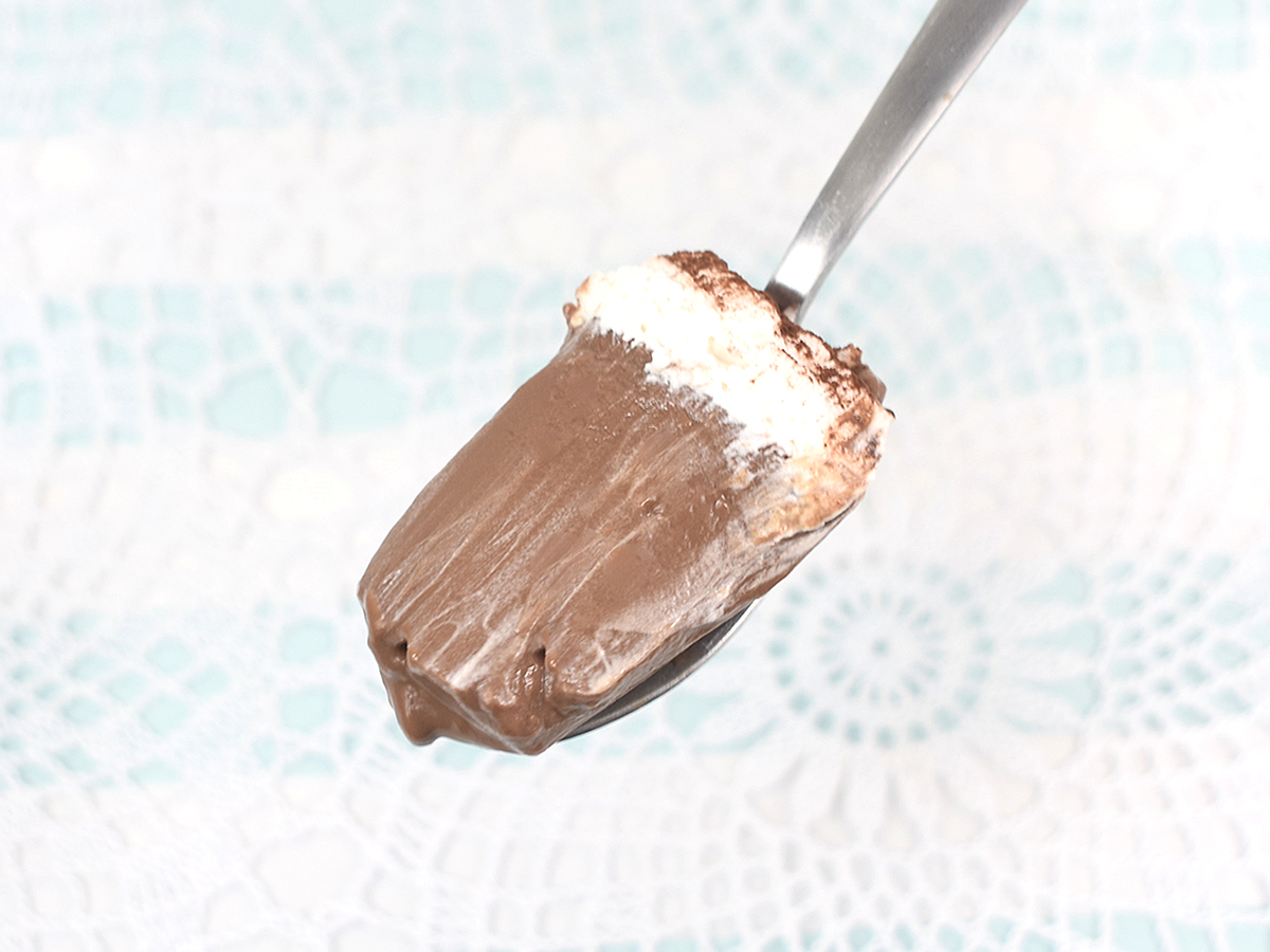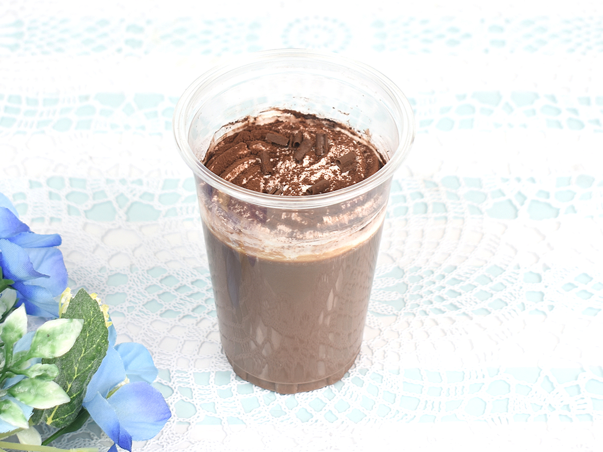 小型のカップに入り、一見普通のチョコプリンと大差ない見た目。試しにスプーンでつついてみると、しっかりプリン独特の弾力もあります。クリームとココアパウダーがたっぷりトッピングされており、甘いモノ好きにとって申し分のないボリューム感です。