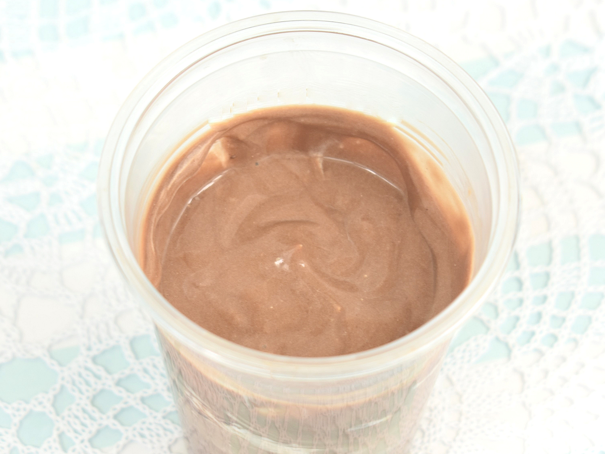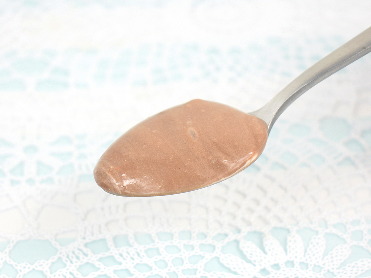 チョコプリンとして食べたあとは、「飲める⁉」を体験してみます。フタのイメージイラストに倣い、チョコプリンを何度かスプーンで混ぜていくと、プリンがとろりとしたチョコクリームのような状態に。