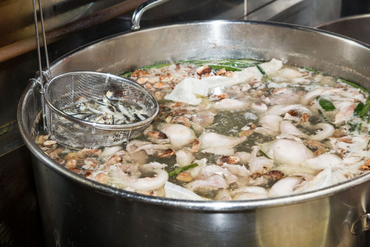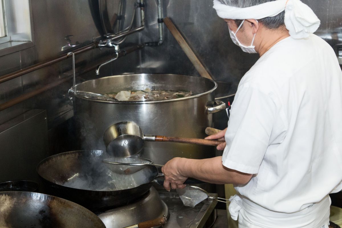 すべてのベースとなるスープは、豚骨をベースにした清湯スープ。朝の5時から仕込みを始め、巨大な寸胴の中でゲンコツや丸鶏、香味野菜や昆布などをじっくりと煮込んでいきます。