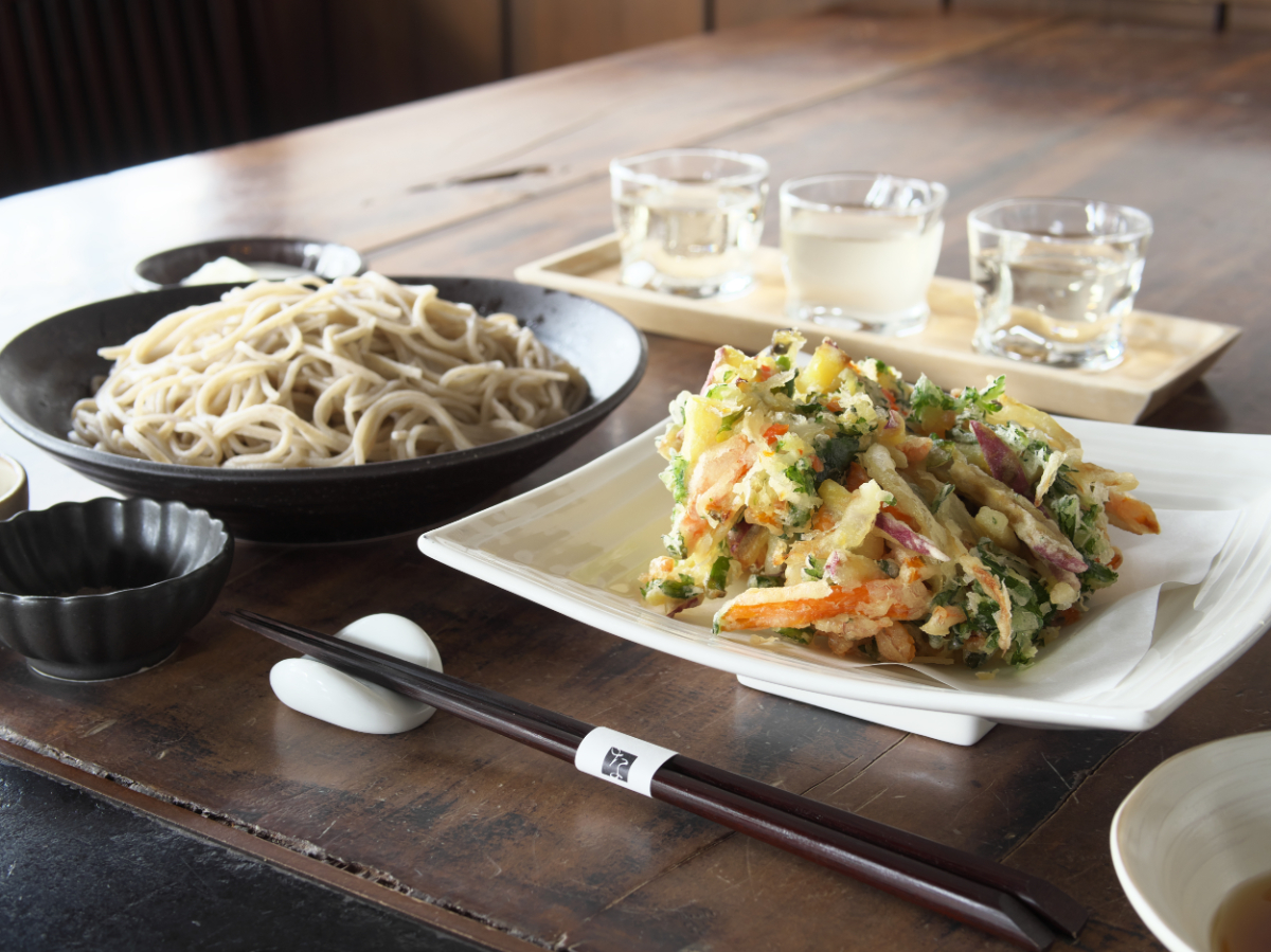 コシのある風味豊かな手打ちそばに、サクッと香ばしいかき揚げが付いたいろいろ野菜のかき揚げ1480円。素材の野菜はもちろん地元産です。蔵+蕎麦 な嘉屋のそばは、そば粉とつなぎの割合が10:1の外一(そといち)で、つなぎの小麦粉も茨城県産を使用。そば打ちに欠かせない水は、酒の仕込み水と同じ酒蔵内に湧き出る井戸水を使っています。お酒を楽しむなら、日本酒を少しずつ味わえる季節の酒三種飲み比べ900円がおすすめ。ビール党には樽生三種飲み比べ900円も人気です。