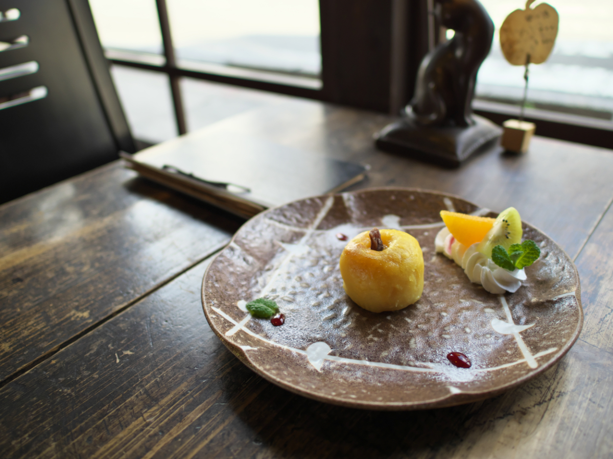 大子町の食材にとことんこだわったメニューが楽しめるのも、daigo caféの魅力のひとつです。一番人気の夢見るリンゴ500円は、リンゴ型のスイートポテトの中に奥久慈リンゴのコンポートが入ったオリジナルスイーツ。リンゴのヘタには地元産の干し柿を使っているそうです。奥久慈紅茶でリンゴのドライチップを煮出した、“あっ!ぷるティー”700円と一緒にぜひ♪
