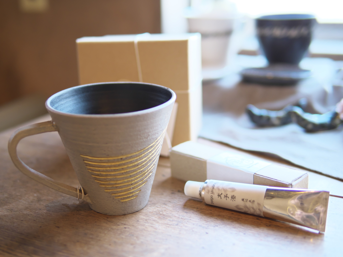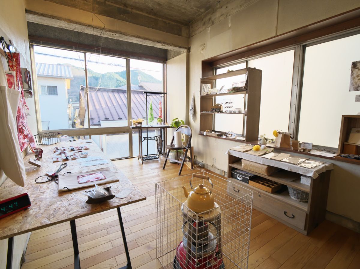 1階で靴を脱いでスリッパに履き替え、リノベーションされた2階の店舗へ。棚には、作家約20人によるアクセサリーやバッグ、キャンドル、布小物などが並びます。写真の漆塗りのマグカップ2600円は地元の漆掻き職人が手がけたもの。自ら採取した大子町産の漆を使い、オフシーズンの冬場に漆器作りを行っているそうです。店名の「memeguru(めめぐる)」は大子弁で「芽が出ること」。この場所から芽が出るように、作品を通して出会いが芽吹くように、そして使われなくなった建物が再生して時が巡り動くように…。memeguruには、飯田さんのそんな想いが込められています。