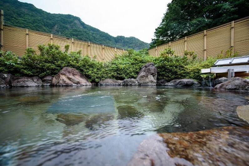 宿のある袋田温泉は平安時代に発見された古湯。大浴場に注ぐお湯は宿の敷地内から湧き出るアルカリ性単純泉で、筋肉痛や関節痛、冷え性などに効能があるほか、湯上がりには肌がツルツル・スベスベになると評判です。内湯は木の香りが心地よい檜風呂。露天風呂は開放感あふれる岩造りの湯船で、奥久慈の山々に抱かれたような自然との一体感が楽しめます。
