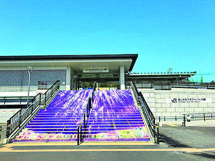 闇に浮かび上がる藤の花が人気漫画に登場するシーンにそっくりだと注目を集めている場所。藤の花房を模したLED電球で、花の咲き始めから散るまでを表現しています。