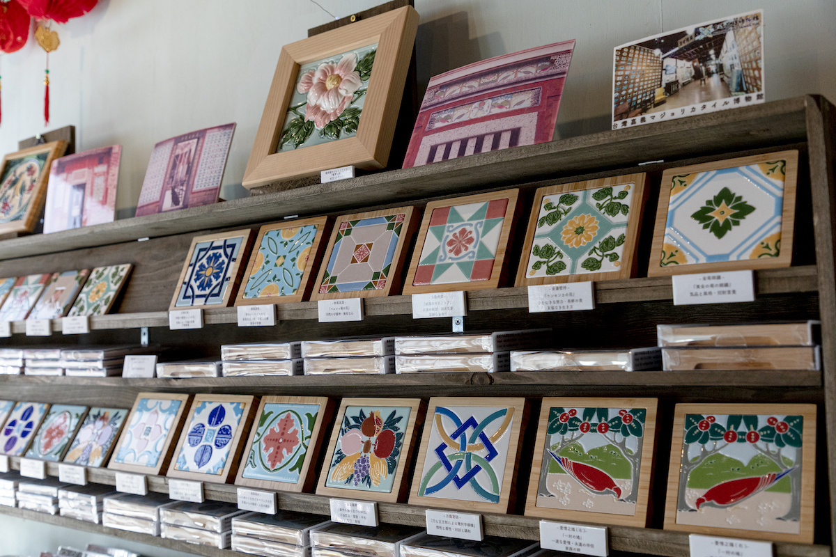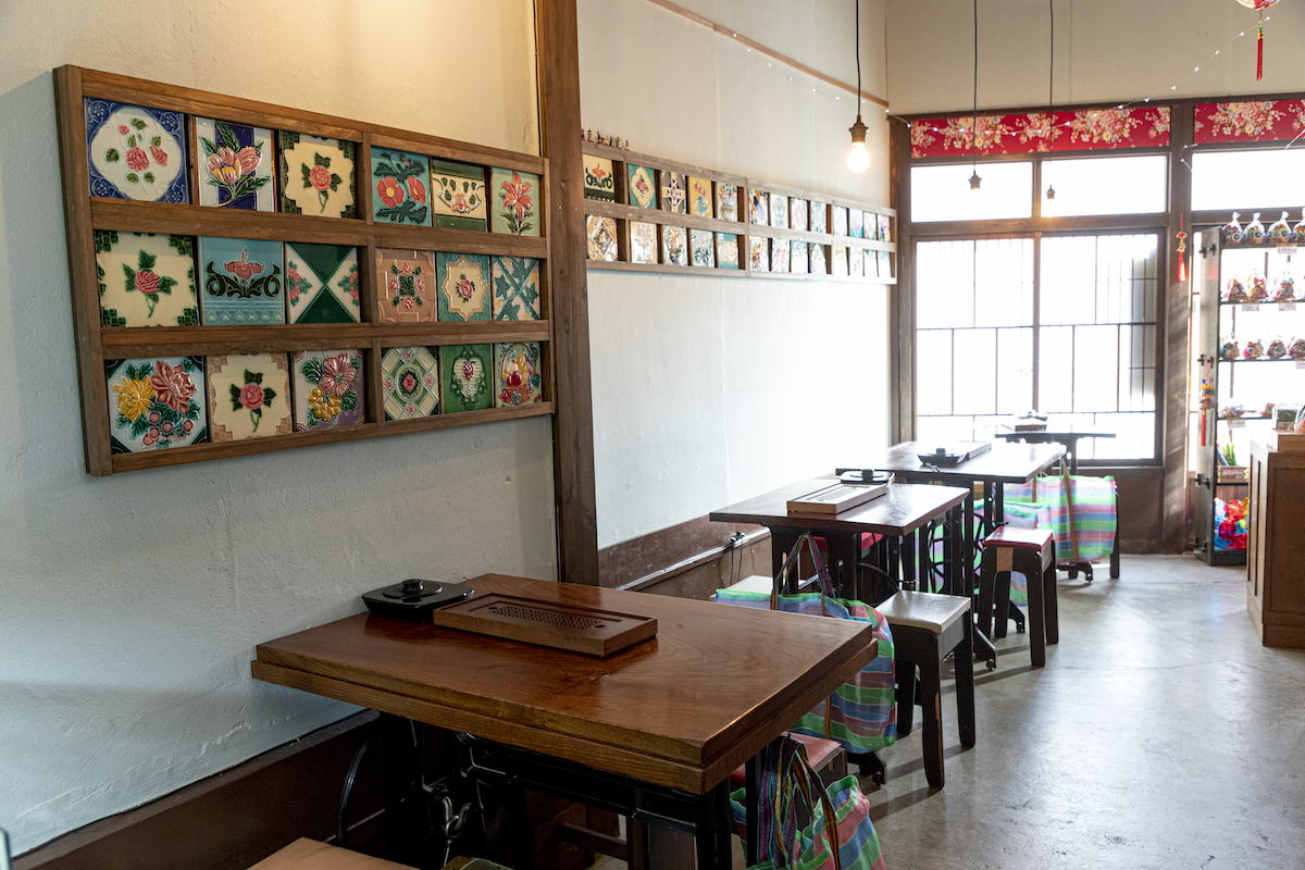 店内を入ってまず目に飛び込んでくるのが壁一面に飾られた美しい台湾マジョリカタイル。これらは約100年前に実際に使われていたという貴重なもの。「台湾マジョリカタイル博物館」から提供してもらい展示しているのだそう。台湾では縁起がよいとされている果物や花などの図案や鮮やかな色使いの数々は、見ているだけでもうっとりしてしまいます。