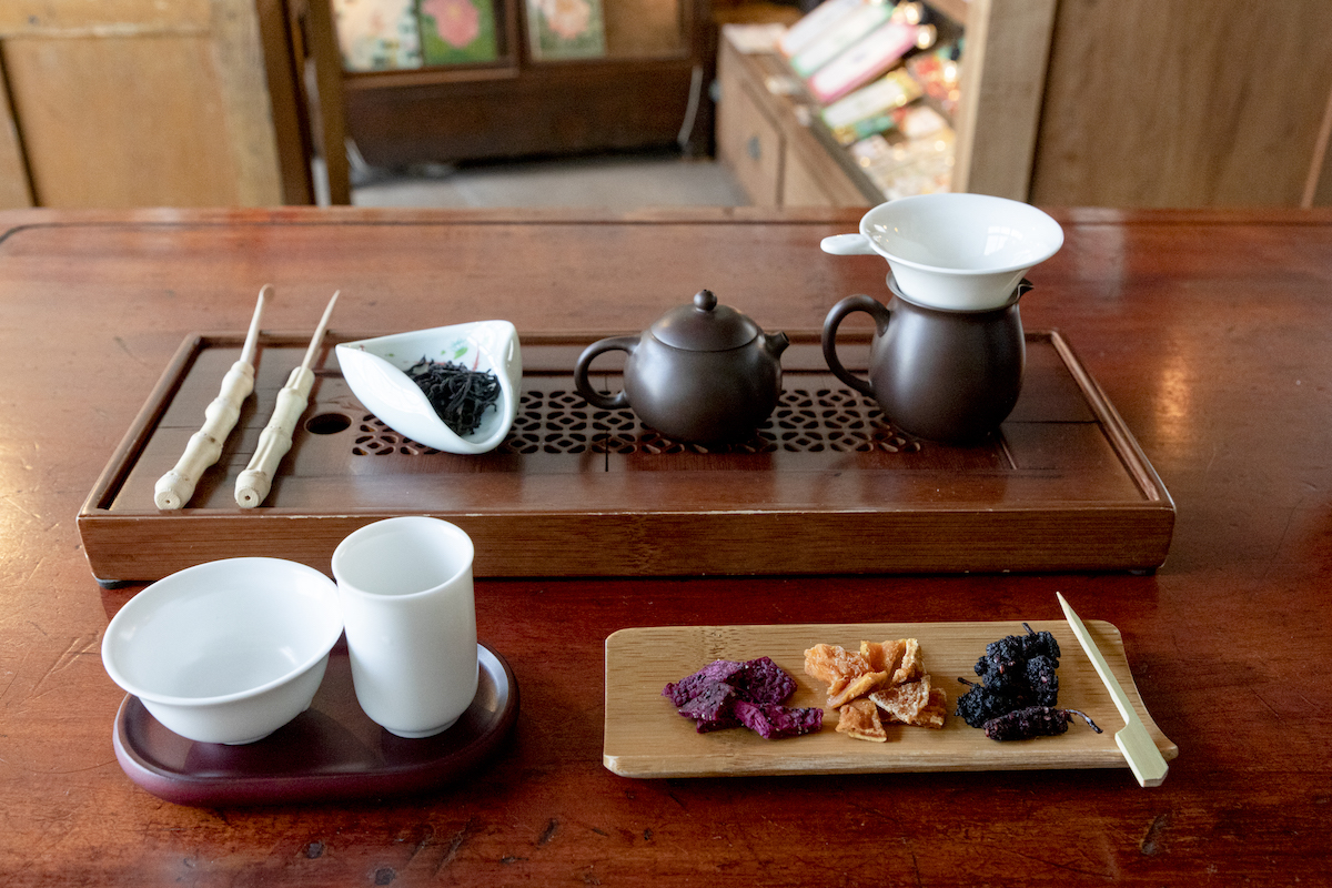 店内には台湾茶をいただけるスペースもあります。メニューは好きな台湾茶1種類+好きなドライフルーツ3種が付いた、台湾茶セット950円〜。台湾茶は、一番人気の「東方美人茶」をはじめ11種類。ドライフルーツは、ドラゴンフルーツや紅心グァバなど8種類。